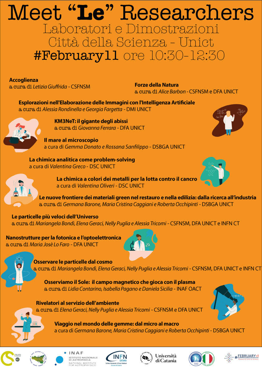 Due ore in cui potrete scoprire esperimenti e dimostrazioni di biologia, chimica, fisica, geologia, intelligenza artificiale e tanto altro. Insieme ad un nutrito gruppo di ricercatrici catanesi osserverete la sabbia al microscopio, scoprirete come la chimica possa servire nella lotta contro il cancro, osserverete il sole con un telescopio, farete un viaggio negli abissi a caccia di neutrini e, ancora, scoprirete come l’intelligenza artificiale permetta di riconoscere alimenti e rifiuti, come sia possibile osservare le particelle che provengono dal cosmo, come riconoscere le gemme, come la fisica vi possa aiutare a proteggere l’ambiente che ci circonda. Esperimenti e dimostrazioni tutti al femminile per conoscere il ruolo delle donne e delle ragazze nella scienza!